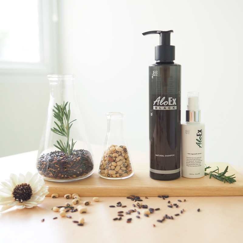 ความสเปเชี่ยลของ AloEx Black Shampoo อยู่ที่สารสกัดของข้าวเหนียวดำ ที่เป็นโปรตีนชั้นดีให้กับรากผม และยังลดสารต้านอนุมูลอิสระที่เป็นสาเหตุของหนังศีรษะอ่อนแอ ช่วยเข้าไปเพิ่มความชุ่มชื่น และสร้างความหนาแน่นให้กับเส้นผม หมดปัญหาสำหรับสาวที่เคยผมบาง หลุดร่วงง่ายๆ ใช้เป็นประจำยิ่งช่วยให้เส้นผมงอกใหม่ได้เร็วขึ้น และต้องไม่ลืมใช้คู่กันกับ AloEx Hair Regrowth Serum จะยิ่งเห็นผลชัดเจน ด้วยเซรั่มที่สามารถพกพาและใช้ได้สะดวก จะเลือกใช้บำรุงหลังสระผมหรือระหว่างวันก็ได้ ด้วยเทคโนโลยีการผลิตที่สามารถสกัดสมุนไพรได้ในอณูที่ละเอียดมากๆ จึงซึมเข้าเส้นผมง่ายและแห้งไว ไม่ต้องกลัวว่าจะเหนียวเหนอะหนะ หลังใช้ให้ความรู้สึกที่เย็นสบาย ส่วนใครที่นั่งห้องแอร์นานๆ หรือเหงื่อออกเยอะ จะใช้เพื่อปรับสมดุลความมันบนหนังศีรษะก็เวิร์คนะ ส่วนผมทำสี ผมดัดก็ใช้ได้เลย ไม่ส่งผลต่อสีและรอยดัดเเถมยังช่วยบำรุงผมไปในตัวด้วย